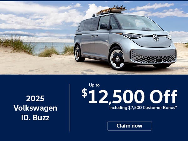 *Volkswagen of America, Inc. will apply up to $12,500 Off including $7,500 Customer Bonus when you lease or purchase a new, unused 2025 Volkswagen ID. Buzz through participating dealers until April 30, 2026. Bonus cannot be combined with discounted Volkswagen Financial Services Special Lease or Wells Fargo Special APR Programs, or on Fleet or Dealership Sale Program vehicles. Bonus applied toward lease or purchase and is not redeemable for cash. See your dealer for details.