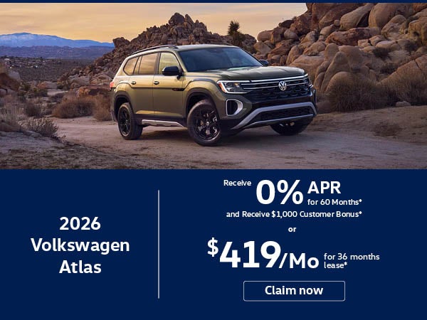 *0% APR, no down payment required, available on new, unused 2026 Volkswagen Atlas models financed by Wells Fargo through participating dealers. Example: For 0% APR, monthly payment for every $1,000 you finance for 60 months is $16.67. Not all customers will qualify for credit approval or advertised APR. Subject to credit approval by Wells Fargo. *Volkswagen of America, Inc. will apply a $1,000 Customer Bonus when you lease or purchase a new, unused 2026 Volkswagen Atlas through participating dealers until April 30, 2026. Bonus cannot be combined with discounted Volkswagen Financial Services Special Lease or Wells Fargo Special APR Programs, or on Fleet or Dealership Sale Program vehicles. Bonus applied toward lease or purchase and is not redeemable for cash. Offer not valid in Puerto Rico. See dealer for details. *Example: For $419/month lease, term is 36 months. Total of payments is $15,084. Not all customers will qualify for credit approval. Subject to credit approval by Wells Fargo. Offers end April 30, 2026. Offer not valid in Puerto Rico. See dealer for complete details.
