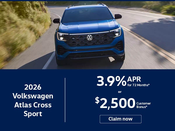 *3.9% APR, no down payment required, available on new, unused 2026 Volkswagen Atlas Cross Sport models financed by Wells Fargo through participating dealers. See VIN: 1V2DC2CA0TC220166. $4,999 due at signing. Excludes tax, title, license, options and dealer fees. No security deposit. For well-qualified customers. Limited inventory available. Example: For 3.9% APR, monthly payment for every $1,000 you finance for 72 months is $15.64. Not all customers will qualify for credit approval or advertised APR. Subject to credit approval by Wells Fargo. Offer ends April 30, 2026. Offer not valid in Puerto Rico. *Volkswagen of America, Inc. will apply a $2,500 Customer Bonus when you lease or purchase a new, unused 2026 Volkswagen Atlas Cross Sport through participating dealers until April 30, 2026. Bonus cannot be combined with discounted Volkswagen Financial Services Special Lease or Wells Fargo Special APR Programs, or on Fleet or Dealership Sale Program vehicles. Bonus applied toward lease or purchase and is not redeemable for cash. See your dealer for details.