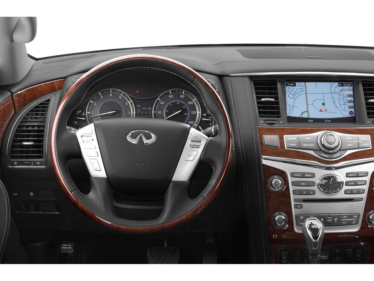 - Radio: AM/FM/HD w/Single In-Dash CD/DVD Player & MP3 -inc: INFINITI controller w/8-inch touch-screen display, INFINITI InTouch navigation w/voice recognition, lane guidance and 3D building graphics, INFINITI InTouch services includes 12-months of safety, security and convenience services, Bose 13-speaker premium sound system including 2 subwoofers, streaming audio via Bluetooth® wireless technology, Bluetooth® hands-free phone system, hands-free text messaging assistant, Radio Data System (RDS), speed-sensitive volume control, driver's audio stage, SiriusXM radio w/90-day complimentary trial, SiriusXM Traffic w/4-year complimentary trial access to real-time traffic information, SiriusXM Travel Link w/4-year complimentary trial access to weather, fuel prices, stocks, sports and movie times and 2 first row USB connection ports for iPod interface and other compatible devices