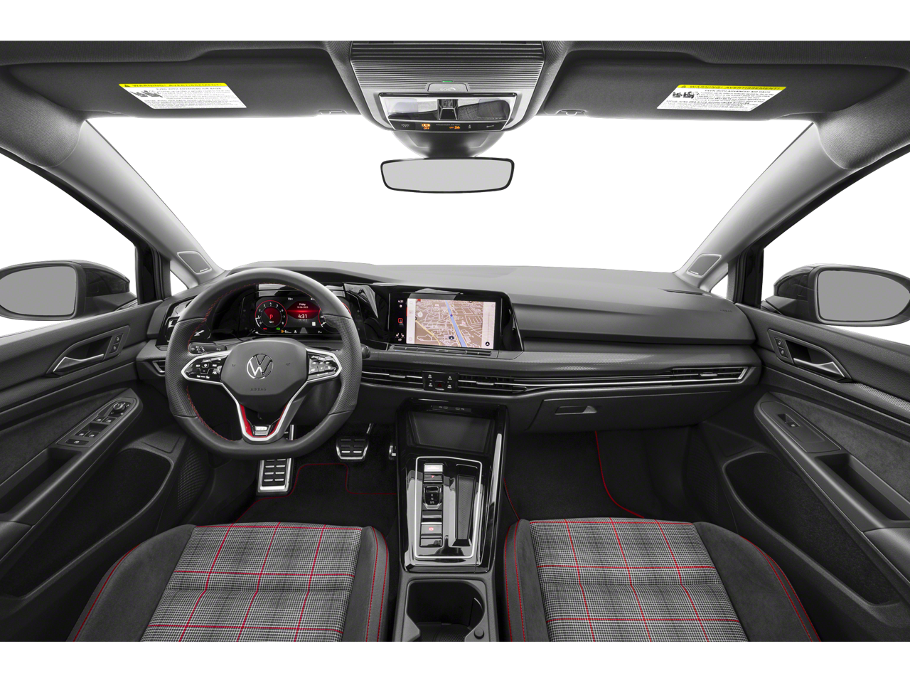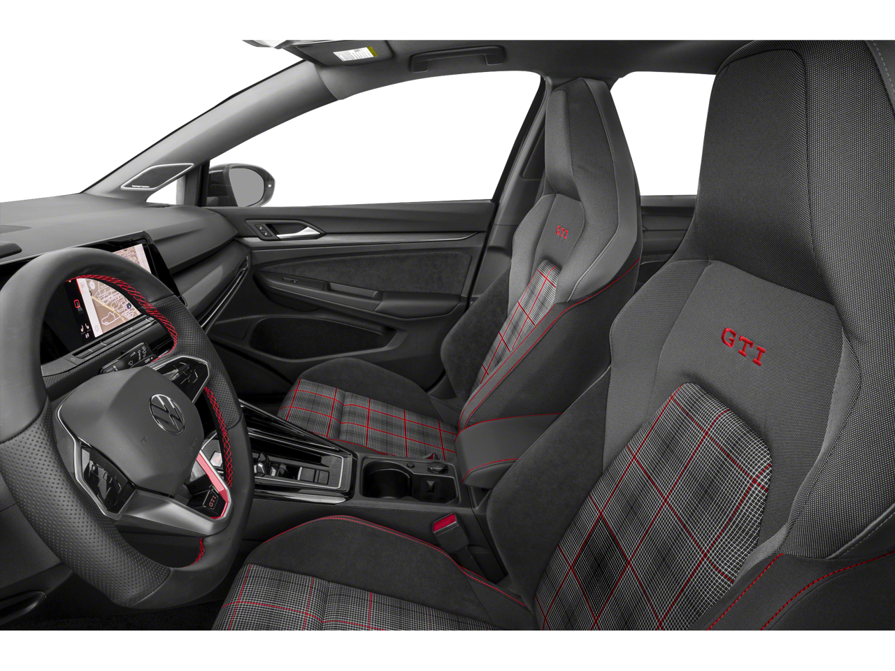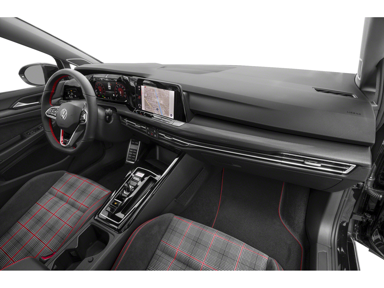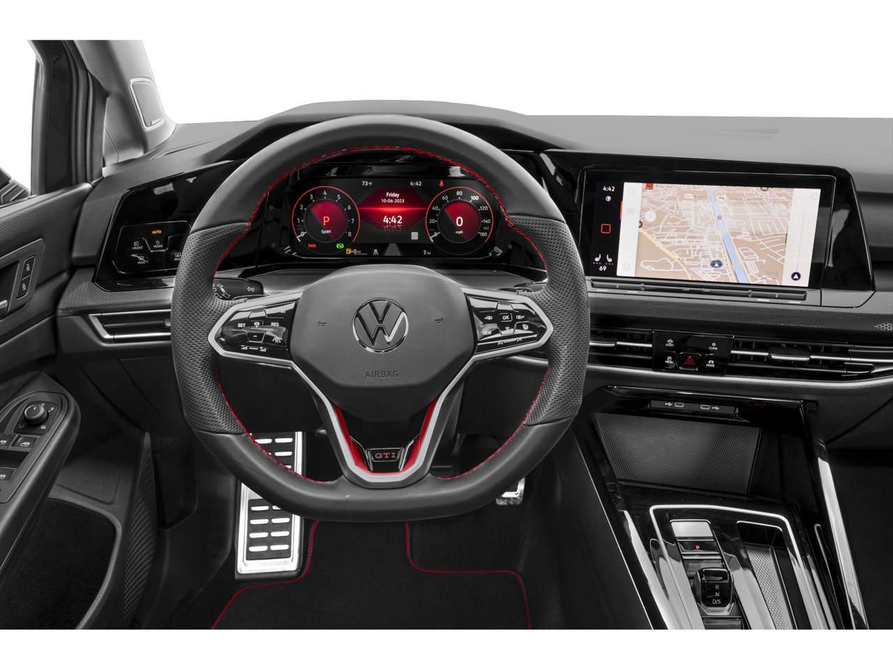 The interior of this Golf GTI is meticulously crafted, featuring premium cloth seating, a leather-wrapped steering wheel, and a host of advanced technology. The Discover Pro navigation system, with its 10-inch touchscreen, provides seamless connectivity and intuitive controls, while the harman/kardon® premium audio system delivers a concert-hall experience.
